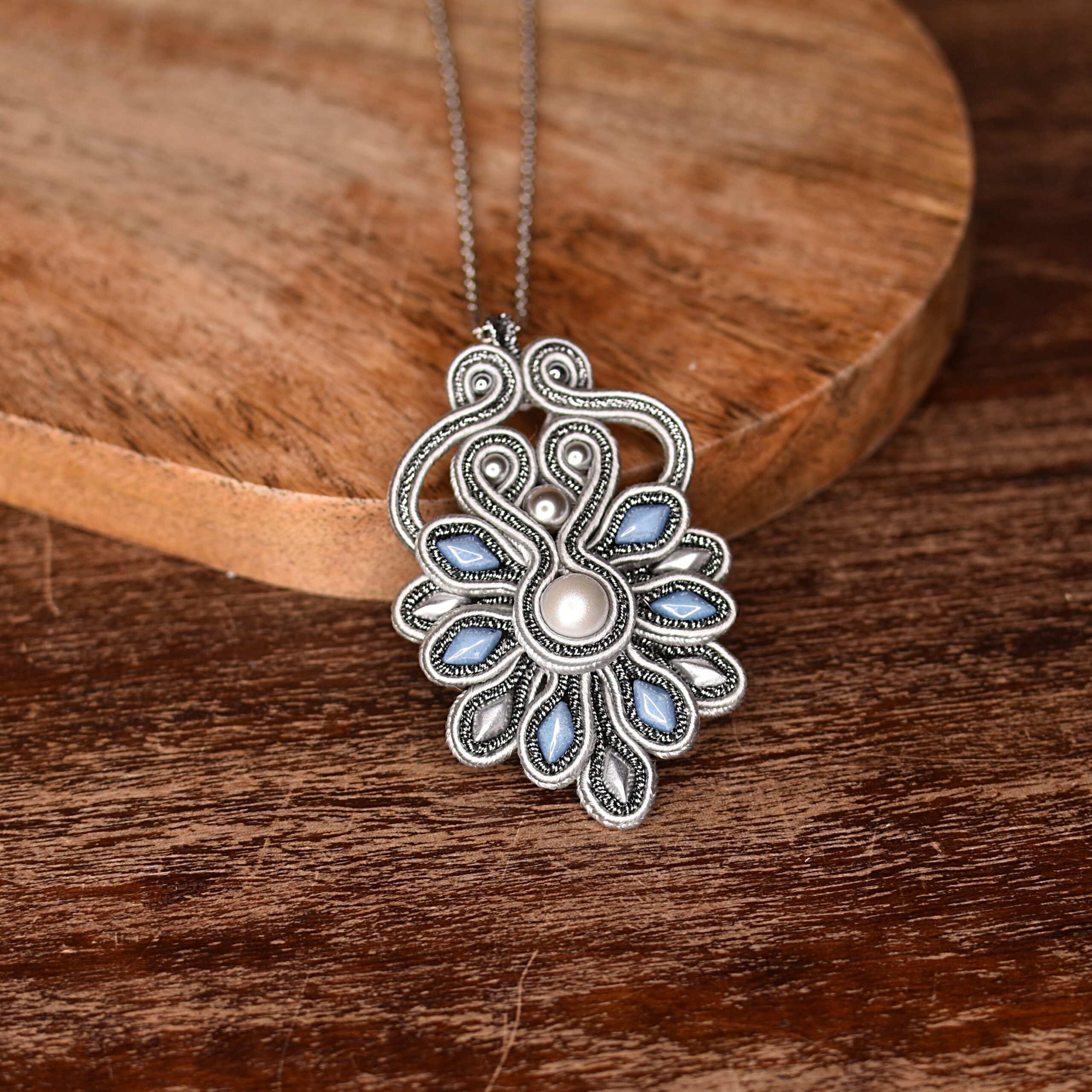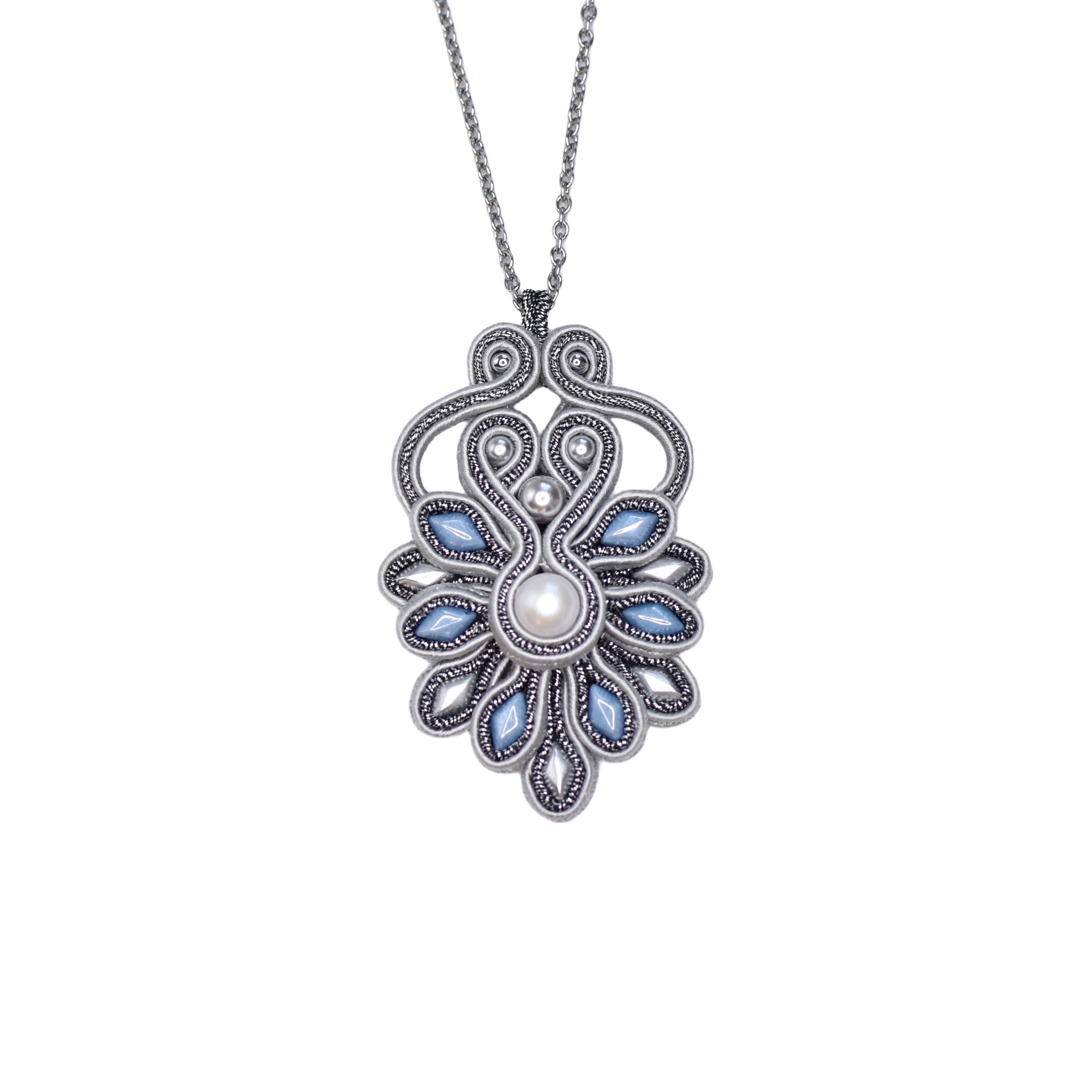 Centralnym elementem jest perła Swarovskiego oraz perły Preciosa, które nadają wisiorowi ponadczasowej elegancji i miękkiego, perłowego blasku. Całość dopełniają starannie dobrane szklane elementy Czech Beads, pięknie odbijające światło i podkreślające wyjątkową formę projektu.
